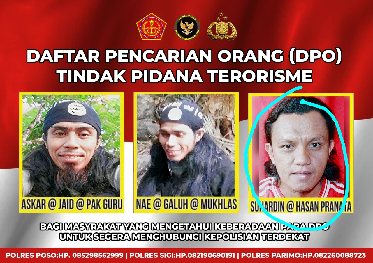 “Berdasarkan hasil identifikasi tim inavis Polda Sulteng, DPO teroris kelompok MIT Poso yang meninggal adalah Suhardin alias Hasan Pranata. Saat ini jenazah sudah berada di Rumkit Bhayangkara Palu,” jelasnya, seraya menambahkan dari tas pelaku ditemukan beberapa butir amunisi, parang, bom lontong yang didisposal, peralatan masak, puluhan paku, dan barang-barang lain,” akunya.