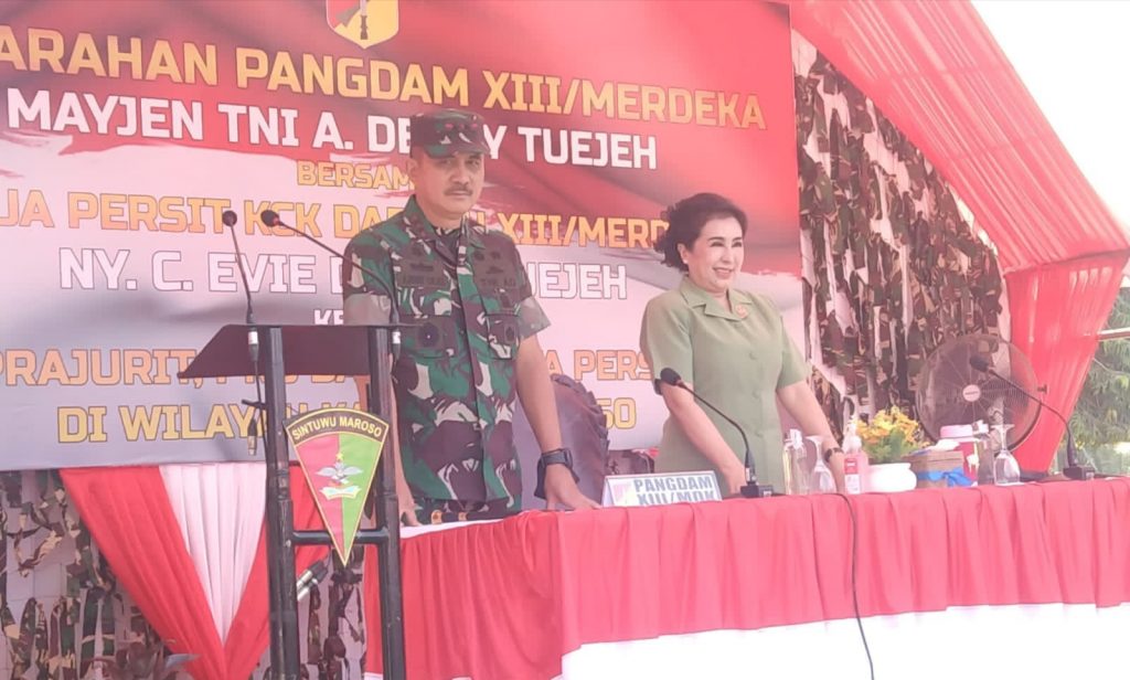 Pangdam XIII Merdeka didampingi istrinya Ny Cicilia Evie Denny Tuajeh yang juga Ketua Persit KCK PDXIII Merdeka bersama rombongan mendatangi Denzipur 15/SLM Desa Tongko, Kecamatan Lage untuk melakukan peninjauan satuan.
