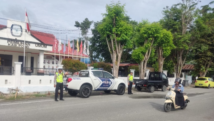 POSO, DETAIL73.COM – Satuan Tugas (Satgas) Keamanan, Keselamatan, dan Ketertiban Lalu Lintas (Kamseltibcar Lantas) Polres Poso, Sulawesi Tengah, melaksanakan patroli rutin dengan sasaran kantor penyelenggara pemilihan umum (Pemilu). Senin (15/01/2024).